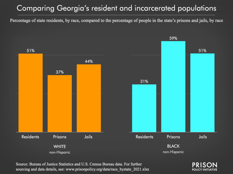 In Georgia, like across the country, mass incarceration has a disproportionate impact along racial lines. Black residents in the state are incarcerated at significantly higher rates and, therefore, are counted in the wrong place more often than Georgia’s white residents. Black residents make up 31% of the state population, but 59% of people in prisons and 51% of people in jails.
